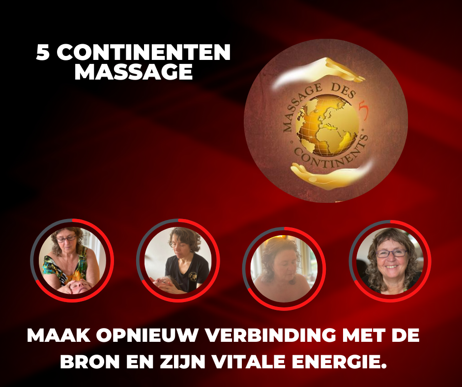 Nieuw in onze praktijk is de 5 continenten massage, een bijzondere massage waar gewerkt wordt met preparaten van plantaardige essentiële oliën, die in verschillende fasen worden toegepast. De eerste olie is voor ontgifting, bevrijding van het oude; de tweede olie is voor revitalisering, het opvullen van de ruimte in het lichaam en energieveld met nieuwe mogelijkheden, op een ander level brengen oftewel ‘embodiment from the future’.